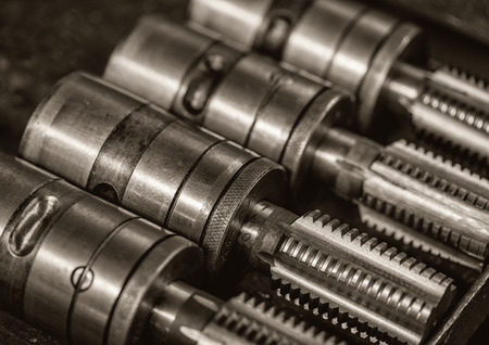 Close up of numerous dark metallic industrial parts, including shafts, pipes, and tools, with visible textures, splines, and a damp, worn appearance.