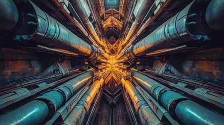 A mesmerizing view showcasing the intricate symmetry of large metallic pipes and structures, illuminated by warm light in an industrial setting.