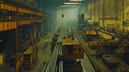 A captivating view of an industrial warehouse featuring heavy machinery and steel beams. The dim lighting adds an ambiance of labor and industrialism.