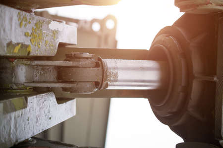 Close-up of an iron industrial motor lies on a table during the production of new modern trucks in a factory. The concept of reliable and high-quality special cars
