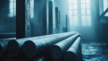 A moody industrial workshop scene featuring cylindrical metal rods and textured surfaces illuminated by soft ambient light, creating an atmospheric effect.