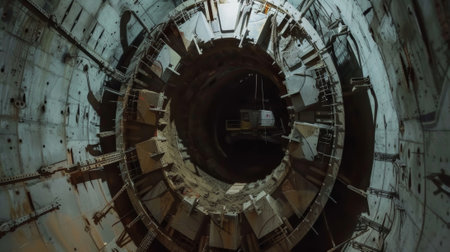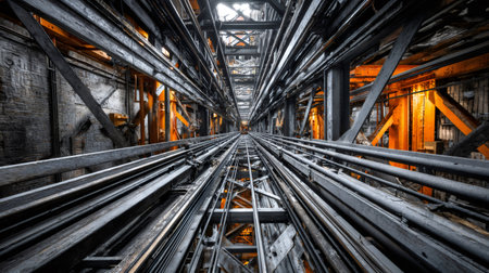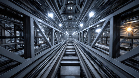 Low angle view of an elevator shaft with metal beams and cables, creating a powerful industrial scene