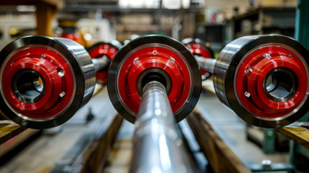 A view of a cars axle with four bright red wheel bearings in the center each one meticulously aligned with precision