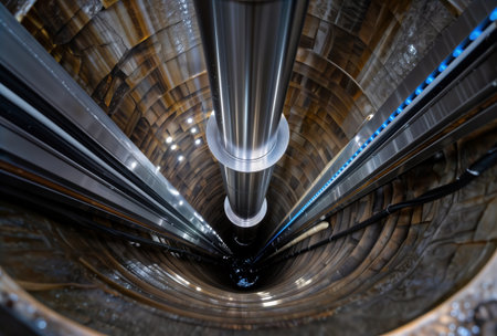 Inside view of a deep elevator shaft with a central hydraulic piston and metal tracks.
