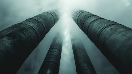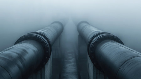 Atmospheric image featuring large industrial pipes emerging from thick fog, creating a sense of mystery and depth. Perfect for themes of industry and infrastructure.