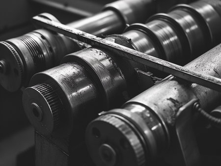 Close-up view of industrial machinery showcasing a series of metal rollers used in manufacturing processes. The equipment emphasizes the intricate design and functionality essential in modern production environments.