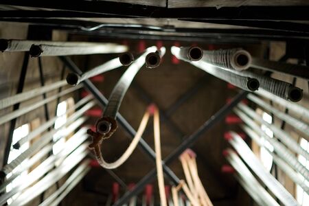 Electric cables of tram close up background