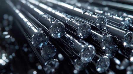 Stunning close-up of polished metallic rods, showcasing intricate texture and reflections, perfect for backgrounds or industrial-themed designs and visual art projects.