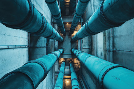 A captivating view of industrial pipes and machinery in a dimly lit factory, showcasing a stunning interplay of blue and orange lighting, highlighting the intricate details of the structure.