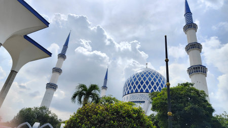 Selangor, Malaysia - Dec 8, 2025: A scenic view of the iconic Sultan Salahuddin Abdul Aziz Mosque in Shah Alam, featuring its blue dome and tall minarets against bright cloudy sky.