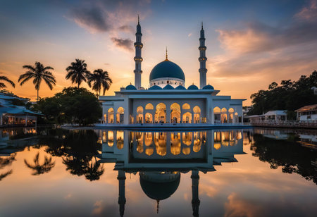 A grand mosque is showcased, bathed in warm light against a twilight sky. Its architecture is emphasized by symmetrical reflections on a calm water surface. The composition uses symmetry and an expansive view to enhance its appeal. This image could be suitable for editorial or commercial content.