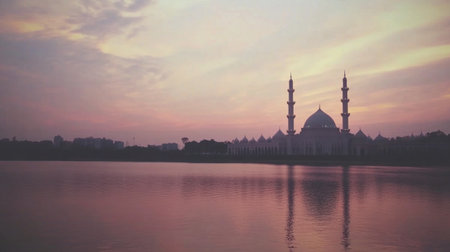 A serene view of the landscape, directed in the style of Peter Jackson, featuring a front shot of a beautiful mosque on Putrajaya Lake at sunset with a pink and orange sky. The scene is captured using a wide-angle lens and natural lighting. --chaos 30 --ar 16:9 --v 6.1 Job ID: 944117dd-42de-4f2a-a559-d9c1af82c0c5