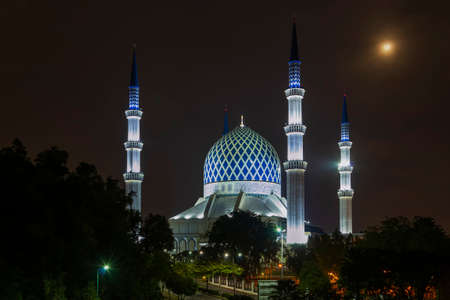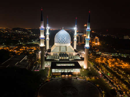 Beautiful aerial night shot of Sultan Salahuddin Abdul Aziz Shah Mosque, an iconic mosque that is also known as Shah Alam Mosque with city scape in the background