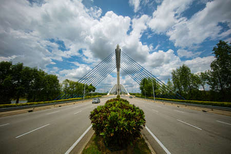 Panorama of the Seri Saujana Bridge in Putrajaya, Malaysia the Malaysian Government city 40 km outside of Kuala Lumpur. Wide angle panorama of the cable stayed bridge from the middle of the road