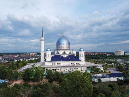 sri sendayan mosque at sendayan negeri sembilan malaysia dramatic blue hour aerial shot