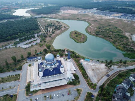 Drone view of Masjid Sultan Salahuddin Abdul Aziz Shah or Blue Mosque in Shah alam ,Selangor, Kuala lumpur, Malaysia. Sultan Salahuddin Abdul Aziz Mosque is the biggest mosque in Malaysia.