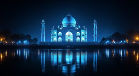 The Taj Mahal shines brightly in shades of blue under a clear night sky, reflecting beautifully in the adjacent Yamuna River. Visitors admire this iconic monuments unique illumination.