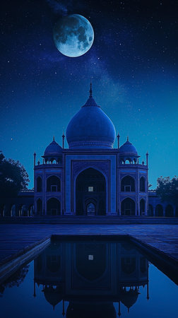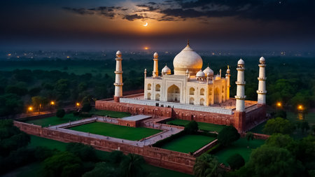 Taj Mahal In Agra, Uttar Pradesh, India. Night view Of Taj Mahal. Seven World Wonders. Night stars above Fabulous Taj Mahal Travel Concept. Indian Islamic Heritage At Night Time