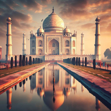 The majestic Taj Mahal stands serenely at sunset with a reflecting pool in the foreground