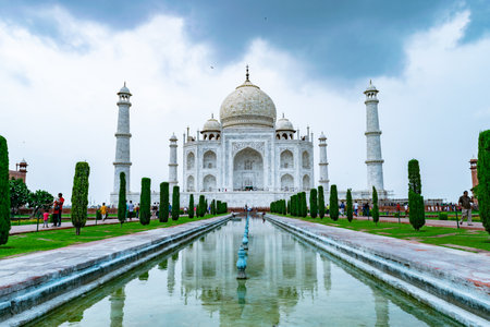 Agra, India - April 10,2014: Wide angle of Tajmahal with it's reflection in the fountain pond, one of the seven wonder partially lit under dramatic sunrise