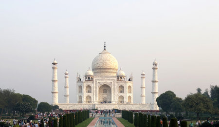 Agra India 2024 October 15 Taj Mahal in Agra, India. Majestic white marble monument with intricate inlay, sacred Mughal architecture, arches, symmetry, water reflections, golden hour light, tourist