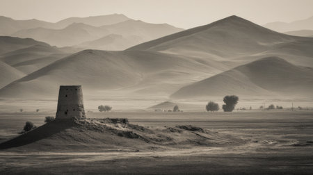 A solitary tower rises from the sandy terrain, surrounded by rolling hills and mountains under a delicate haze, showcasing a tranquil desert scene.