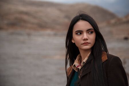 Dramatic portrait of a young brunette girl in cloudy weather against the background of mountains. selective focus, small focus area