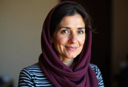 A joyful woman from Afghanistan smiles warmly, displaying a sense of resilience. Her colorful scarf reflects cultural heritage as she sits in her inviting home environment. Generative AI.