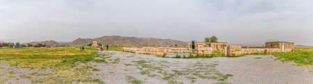 PASARGAD, IRAN - MAY 4, 2015: Panoramic view of the tourists checking out the tomb of Cyrus the Great and the Mozaffarid caravansarai.
