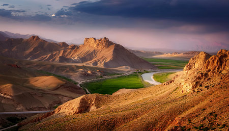 A joyful resident of Afghanistan 45 years old is smiling brightly, embodying the spirit of the region. His traditional attire complements the countryside background. Generative AI
