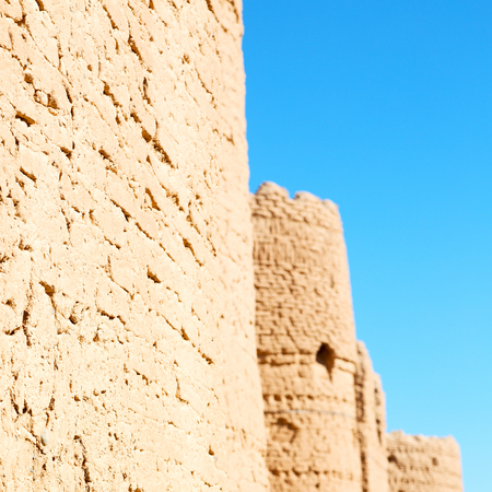 street in the old abandoned Iranian village, buildings and walls are constructed of clay, the bright blue sky