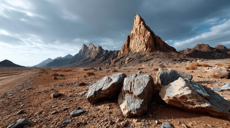 This captivating image features a dramatic rock formation rising from a barren desert landscape. Dark clouds loom above, enhancing the striking beauty.