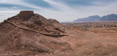 Zoroastrian Tower of Silence with the city of Yazd in the background. Historic burial site in ancient Persia. Yazd, Iran.