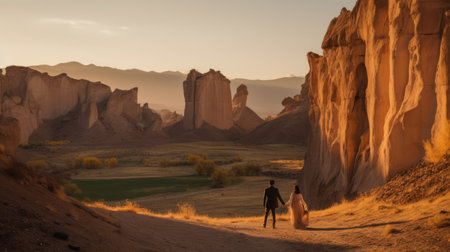 a wide angle shot captures a sense of love and companionship between a manifested and a womankind walking in a family during sunset rock in tajikistan. ai generated