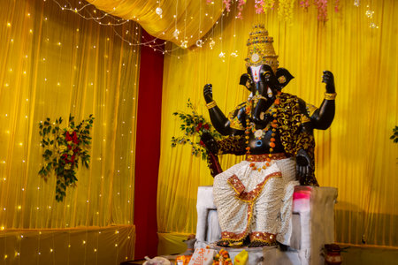 Beautiful sculpture of Lord Ganesh, surrounded by decorative flowers and lights