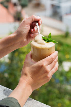 Hands holding trendy Dalgona Coffee on the balcony, outdoor. Iced frothy whipped ultra fluffy texture. Viral social media worthy drink in coronavirus, Covid-19, lockdown, quarantine, stay at home.