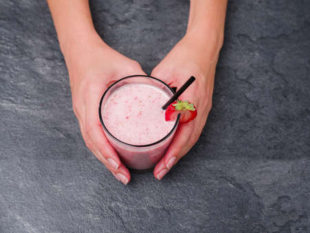 Tasty sweet strawberries and fruits yogurt in a glass on females hand on a gray marble background. Healthy organic drink. Copy space. Close-up of drink. Food concept.
