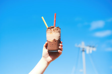 A Refreshing smoothie held high under bright sunlight, showcasing joy and vitality