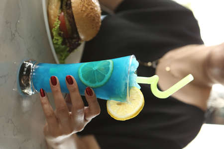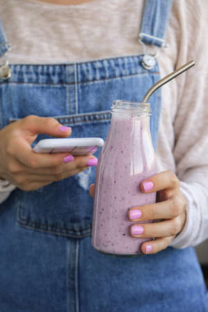 Female hands holding Blueberry smoothie topped with blueberries. Woman drinking glass of breakfast protein smoothie drink. Using mobile phone, social media, snack break, online studying, recipe Vegetarian vegan food