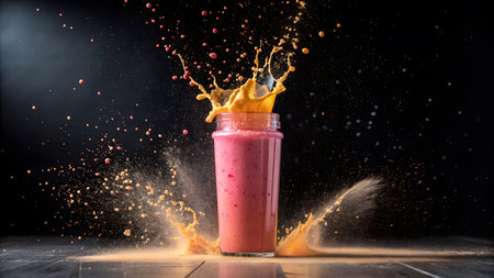 A vibrant fruit smoothie explodes with splashes against a dark background.