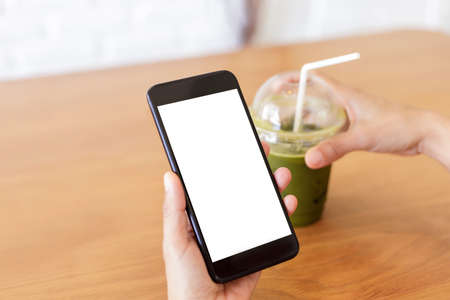 Close up hands of woman using mobile phone, cell phone in coffee shop. Hands of women holding blank empty screen smart phone in cafe. Women relax with mobile phone sit in restaurant