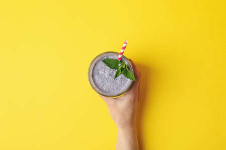 Purple milkshake in a glass with a straw and splashes on a yellow and blue background