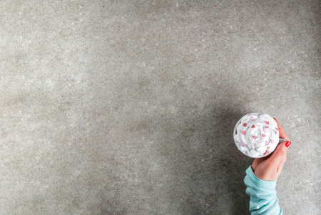 Romantic background, Valentine's day. Girl drinking hot chocolate with whipped cream and sweet hearts, , hands in the picture, top view, copy space