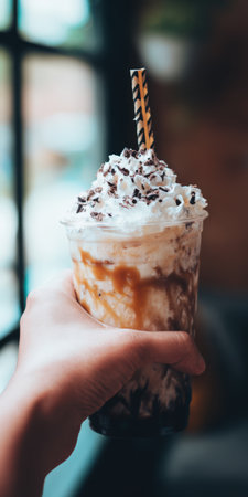 Person holding a cold frappuccino topped with whipped cream and chocolate sprinkles, sipping through a straw in a cafe, close-up capture of a sweet, refreshing iced coffee treat