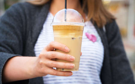 Iced coffee with milk. Iced coffee latte. Woman holding glass cup of iced coffee.