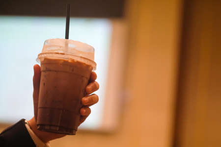Close up young asian man hand holding takeaway plastic cup of delicious iced Mocha coffee