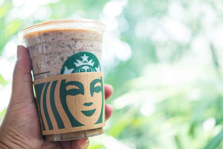 Bangkok, Samut Prakan - May 22, 2022 : Holding a cup of Almondmilk White Chocolate Affogato Frappuccino from Starbucks coffee. Starbucks is the world's largest coffeehouse and is highly popular