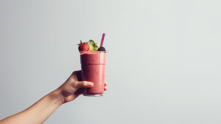 Hand holding a glass of fruit smoothie against a vibrant blue background, promoting health and refreshment