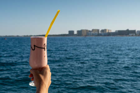 Three female hands are holding strawberry milkshakes on the background of the sea