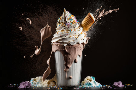 Chocolate milkshake with whipped cream and colorful confetti on black background